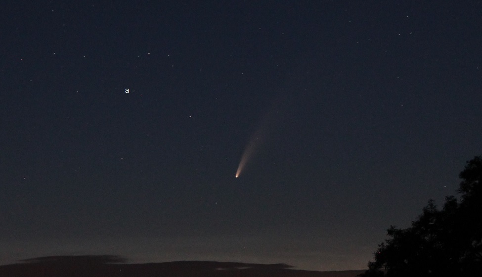Above – 0037 IST; with (a) mag 5.3 SY UMa, separation 3.3°. Below – 0047 IST; Comet NEOWISE and the Plough. Increasing moonlight hindered the Comet’s visibility after this point and by early August its magnitude had dropped to ~5.5, drawing a memorable apparition to a close.