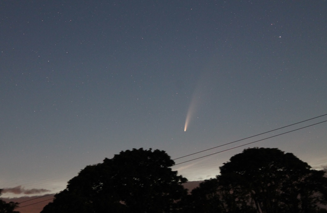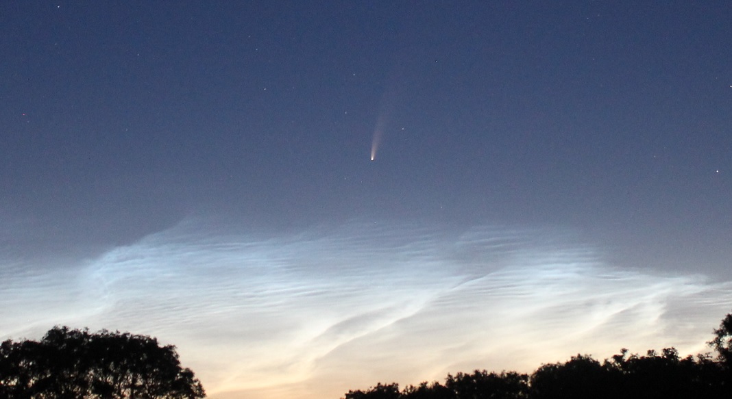 0324 IST; rare conjunction of a naked-eye comet with a spectacular noctilucent cloud display.