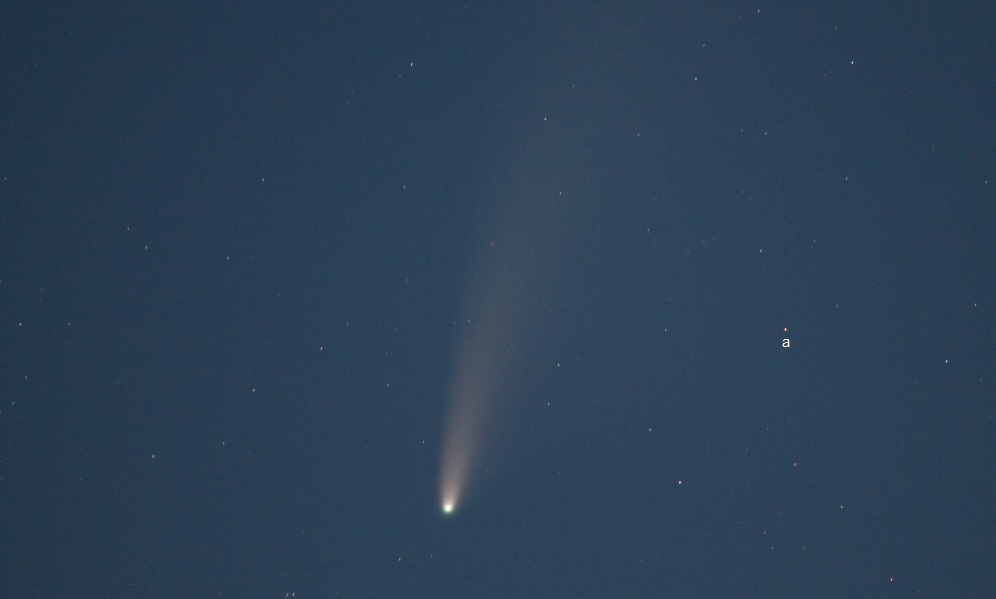 0113 IST; on this night, both dust and ion tails can be seen extending an impressive 15 degrees, in the case of the former, and, using averted vision and a dark background, some 18 degrees for the latter, in the direction of Dubhe and Merak. Below – cropped view; with (a) mag 4.2 kappa UMa and mag 3.1 Talitha, half a degree from the comet.