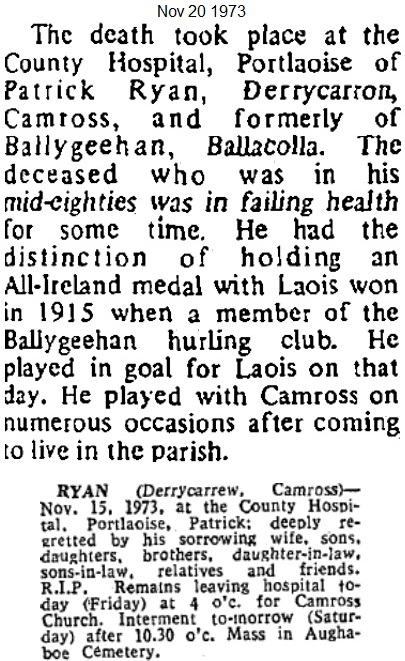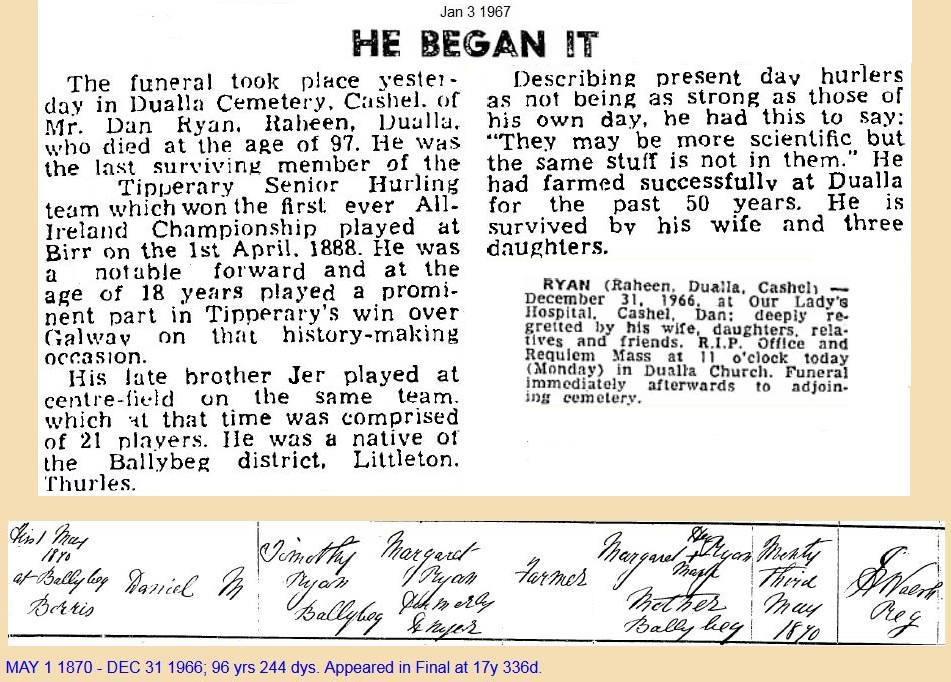 | DAN RYAN | TIPPERARY 1887 | 1870-1966 | 96y 244d |