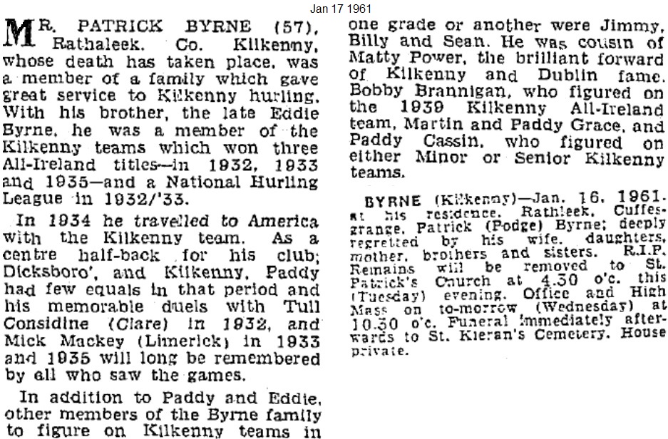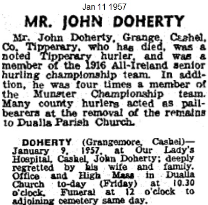 | THREE | John O’Connor, John Cashman, Sean Og Murphy, Morgan Madden, Peter O’Grady, Tom Barry, Mick O’Connell – CORK {7}; Johnny Connolly, Ned Brennan, Bill Devane, Tim Condon, Mike Wall, Tom Semple, Hugh Shelly – TIPPERARY {7}; Dan Stapleton, Jack Anthony, Dan Grace, Pierce Grace, Peter O’Reilly, Podge Byrne, Eddie Byrne, Lory Meagher, Tommy Leahy, Martin White, Jimmy O’Connell – KILKENNY {11}; Joe Phelan – LAOIS/DUBLIN, Martin Hayes, Builder Walsh – DUBLIN; Bob Doherty – CLARE/DUBLIN; Mick Gill – GALWAY/DUBLIN; Bob McConkey, Mick Kennedy, Paddy Clohessy, John Mackey, Timmy Ryan, Jim Roche, Mick Mackey, Paddy Scanlan – LIMERICK {8} [38] |