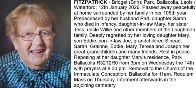 | Alice | McGRATH | (Taylor) | Apr 1 1916 | Apr 15 2021 | 105 Y 14d | Tipperary | |