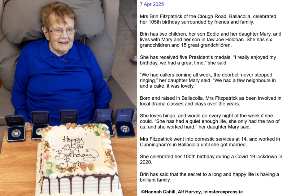 | Nellie | BROWNE | (Casserly) | Oct 15 1918 | Dec 20 2023 | 105 Y 66d | Galway | |