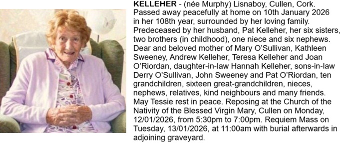 | 29. Kitty | JEFFERY | (Clancy) | Nov 12 1914 | Jan 17 2024 | 109 Y 66d | Cork | |